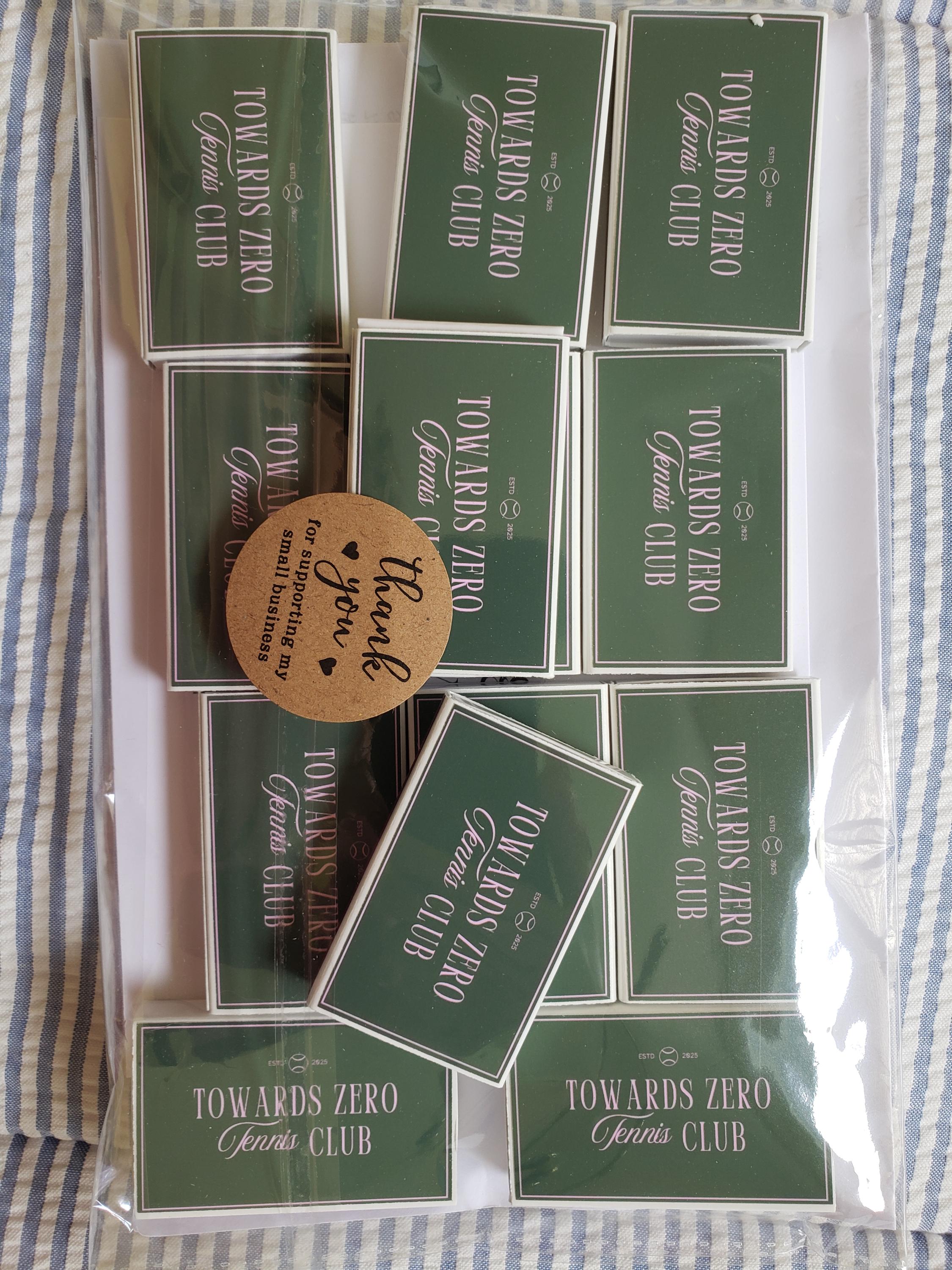 Add a stylish and sporty touch to your event with our Custom Tennis Club Matchboxes! These elegant matchboxes feature a classic tennis-inspired design, perfect for weddings, parties, club events, or as a unique gift for tennis lovers.
